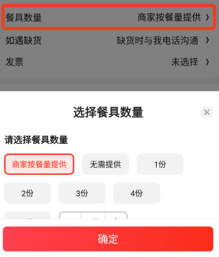10、最后就是选择餐具数量,默认商家按餐量提供。