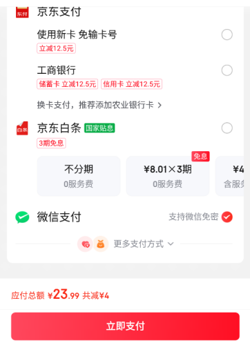 5、支付方式多样:支持京东支付(可享立减优惠)、微信、支付宝等多种支付方式,方便用户结算。