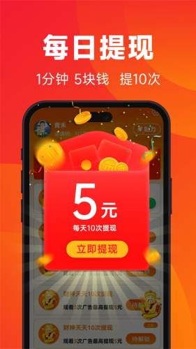 5、轻松赚闲钱,自动提现:每日5次提现机会,每次花1分钟时间,自动微信提现秒到账,收益立马看得见。