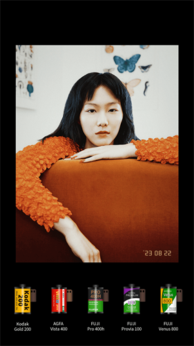 3、下拉胶卷选择栏,可以切换不同胶片效果,并实时预览滤镜风格与画面变化。