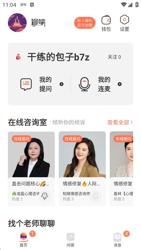 1、主页界面可以自荐成为咨询师,也能找到自己想要的咨询师解决问题。