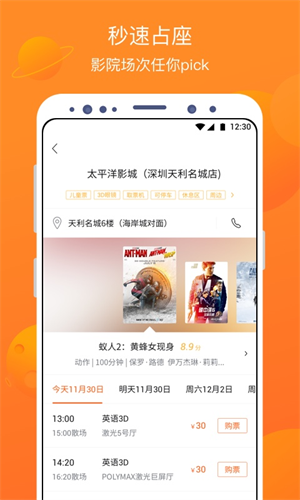 4、身边海量的电影院与电影时间表,供你选择,同时为你推荐好看的电影;