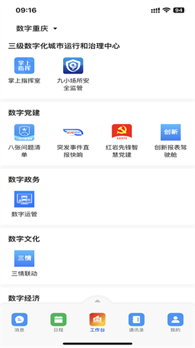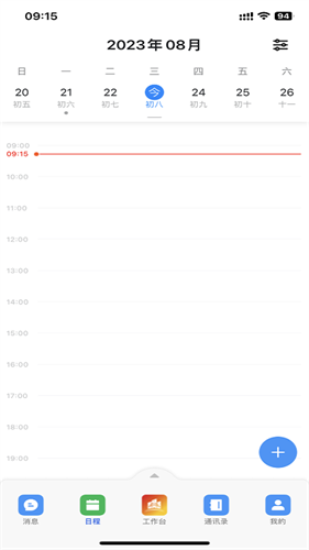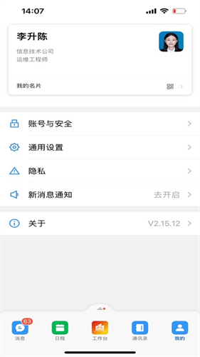 4、界面布局清晰,核心功能集中在消息、日程、工作台、通讯录、我的五大板块。