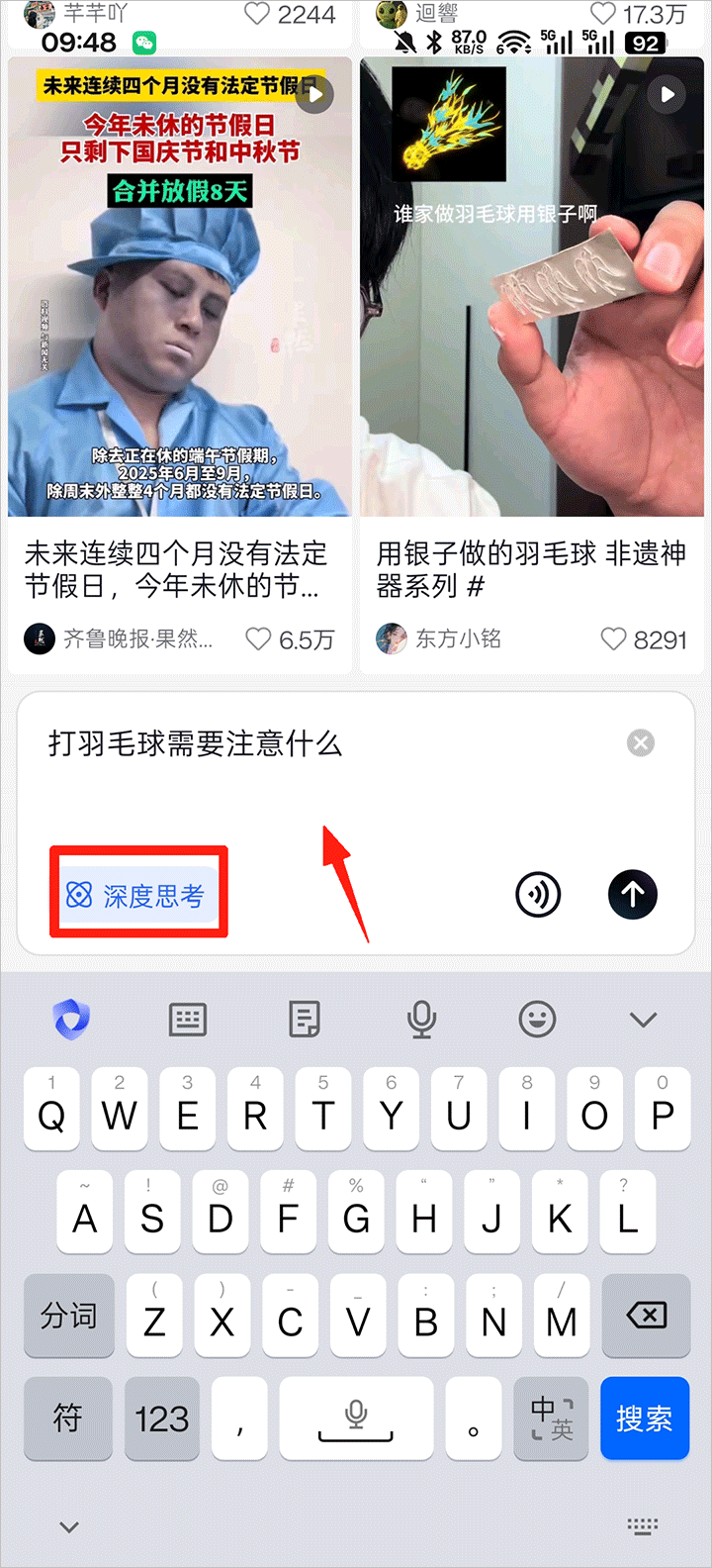 2、还可以启用「深度思考」模式,让搜索结果更可靠。