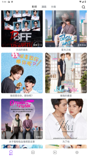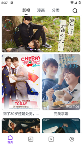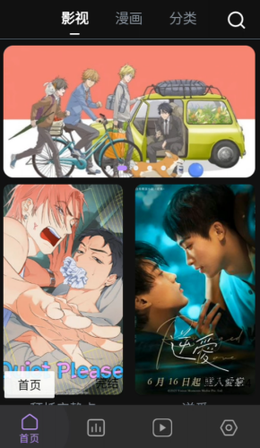 1、打开蛋圈漫画app免费版,首页包含漫画和动漫两种双男主作品种类,喜欢双男主的可以试试这款软件。