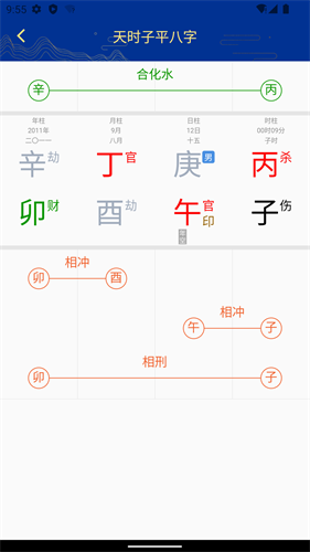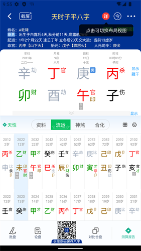 9、实时展示十神与神煞:可查看八字大运流年相应的十神藏干、神煞纳音以及干支合化冲作用关系。