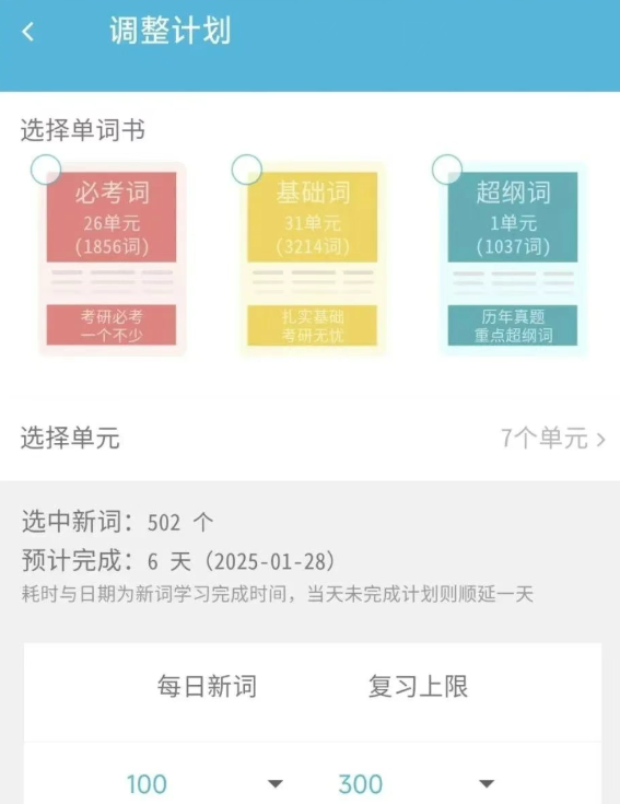 2、弹性计划定制功能,支持按天/周调整必考词、基础词学习量,适配不同备考阶段强度。