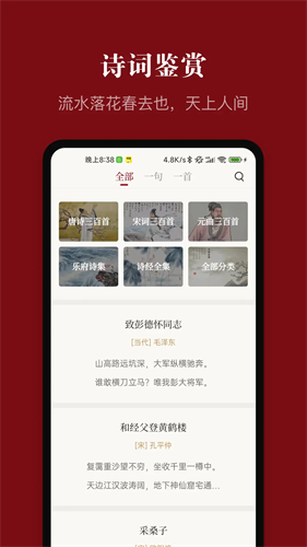 2、诗词界面可以从各种分类来了解,软件也会每天推一句、一首