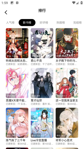 提供人气榜、新书榜、好评榜、热搜榜四大榜单,帮助用户发现高热度或优质新作。
