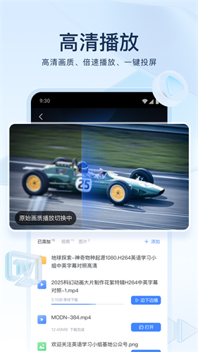 云盘视频内容直接播放,畅享倍速播放、高清画质、一键投屏。