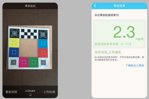 将比色卡放在新生儿的胸部,可自动识别,在判断图像质量、光照环境以及皮肤区域后会自动扫描拍照。妈妈们只需稳住相机,即可得到清晰的宝宝皮肤图像,将图像上传至云端服务器,黄疸拍照通过医学图像处理技术自动计算并返回黄疸数值。