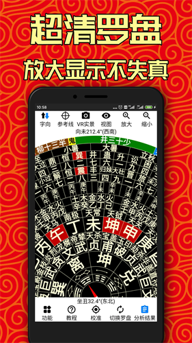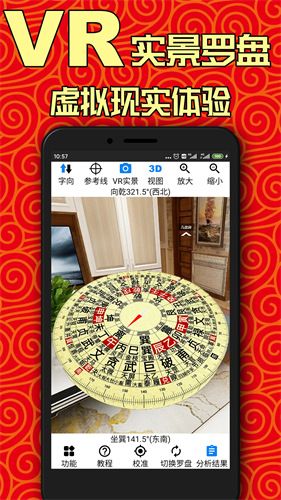 4、摆放罗盘后一键分析八宅布局、九宫飞星、流年,自动辨别天医、生气、延年、伏位、五鬼、六煞、祸害、绝命等方位。点击“VR实景”后自动为真实场景添加方位属性标签。