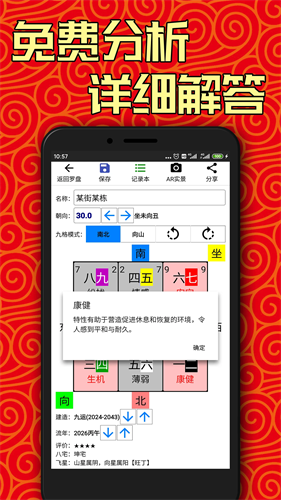 5、实景模式针对房屋方位,大门,卫生间,主卧,次卧,阳台等具体方位凶吉健康分析。