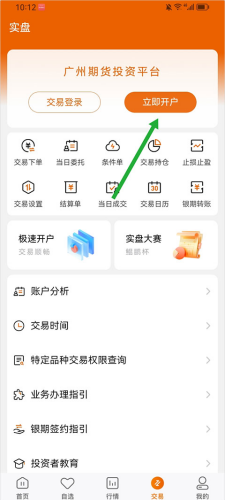 1、打开登录app后进入交易界面点击【立即开户】进入期货交易开户流程。