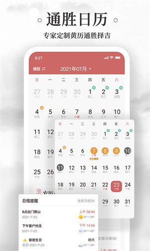拥有完整的老黄历信息,详细罗列出农历节气变化,每日宜忌,吉神凶神,天干五行,同时显示公历、农历等多套历法。
