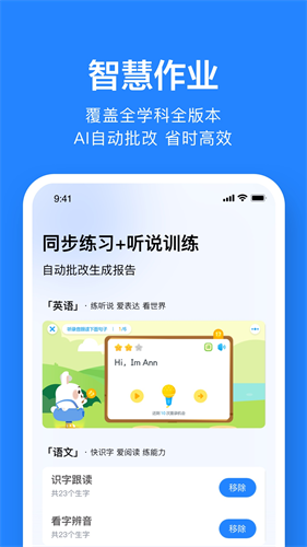 覆盖听、说、读、写功能,帮学生告别死记硬背的低效学习方式,能进行个性化作业点评,关注每一个孩子的变化与成长,还可以发送作业通知、班级通知等,促进与家校沟通。