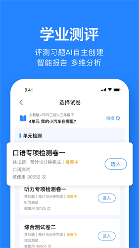 随时随地推荐作业练习,灵活选择随堂训练、同步习题、绘本、口语、配音、试卷,作业练习形式丰富,满足教学需求。