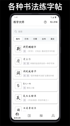 2、集成荆霄鹏等20+位名家字体库,支持自定义字体导入与个性化字帖生成。