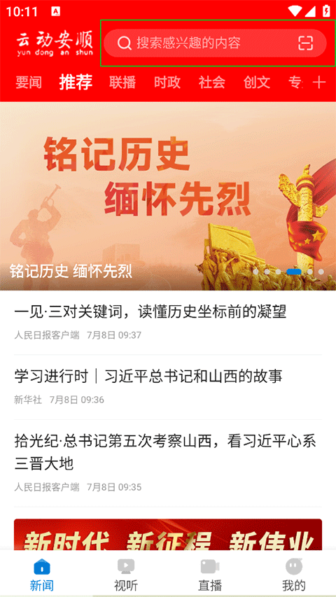 1、打开云动安顺新闻客户端,在首页搜索栏搜索您感兴趣的内容;