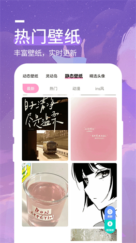 壁纸、分屏壁纸、唯美治愈系风景壁纸、个性文字壁纸、专属姓氏壁纸、卡通动漫壁纸、游戏动态壁纸、影视人物壁纸、液态壁纸等。