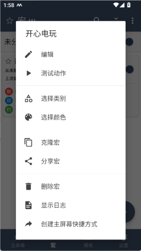 4、在操作栏溢出菜单中(或通过设备上的菜单按钮),您将看到用于克隆宏、共享宏和测试宏的当前操作集的其他选项。