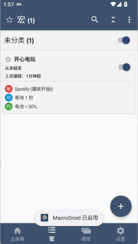 1、在MacroDroid主屏幕上选择“+”或编辑宏页面。
