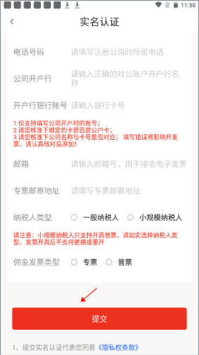 2、在实名认证页面里输入个人和企业的相关信息,最后点击“提交”就可以了,等系统审核通过后就认证成功了。