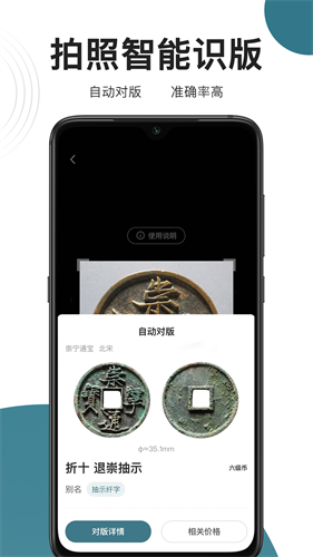 具有AI拍照对版功能,用户只需轻轻一拍,即可进行古钱币拍照对版。