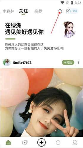 1、用户可进入首页处点击顶部的搜索(下图红色箭头所指)进行好友搜索关注即可。