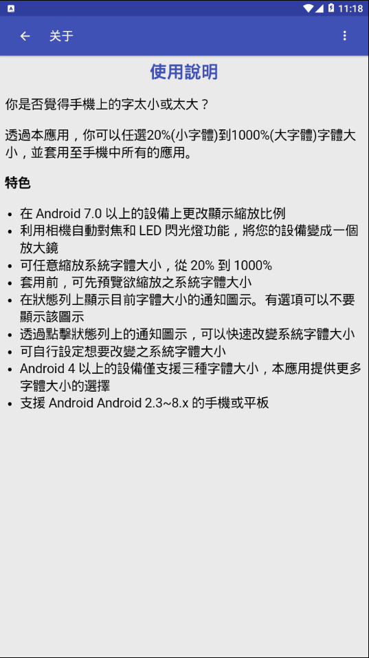 Android 4 仅支援三种字体大小,本应用提供更多字体大小的选择