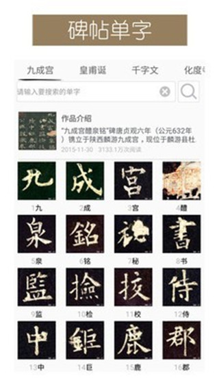 1、碑帖一个字。把經典书法碑帖裁成单字图片,加上米字格,每张展现一张,更便捷、更精确的在移动端读帖、临帖。