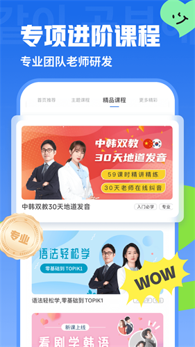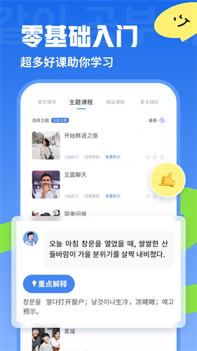 精编吃吃喝喝、人际交往等专题课程,更有热门综艺《RunningMan》、《拜托了冰箱》经典韩剧《来自星星的你》、《请回答1988》……从词、句到对话学习,循序渐进,闯关形式使学习更有动力。