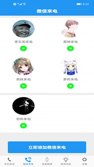 即刻来电app,领导、同事、长辈、朋友、恋人来电、统统可以自定义。一软简单实用的虚拟电话软件,脱身的好帮手。明星偶像给你打来电话,夭夭让爱豆大佬给你打 Moringcall ,每夭都是美好的一天。效果逼真,想要谁给你来电都可以。也可以恶摘朋友,假装爱豆给他来电。