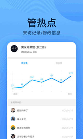 做为热点主人,您能够查询和管理方法您分享的WiFi热点,如查询到访统计分析,设定中文名字、所在位置等信息内容。在帮助他人免费上网的另外,您还能够根据分享WiFi热点总计的工作经验和積分,获得礼物和优惠劵。