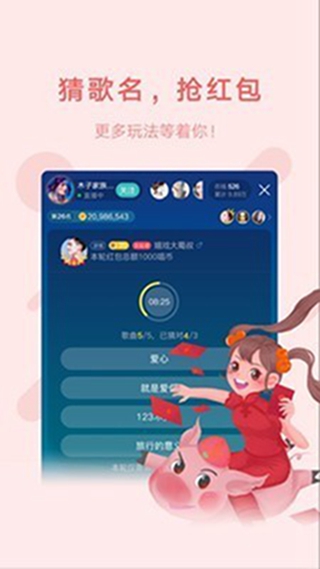 抢麦唱歌、猜歌游戏大红包、对战PK…各种各样精彩纷呈等着你玩!酷炫直播间、大量音乐库一应俱全。