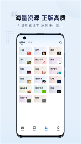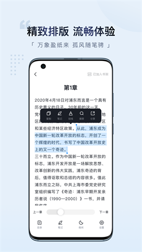 设计简洁,排版精良,EPUB精排版资源提供优质的阅读体验,支持在阅读中添加划线、批注、书签,还可以随心个性化您的主题风格、阅读排版、背景、翻页方式等专属阅读风格。