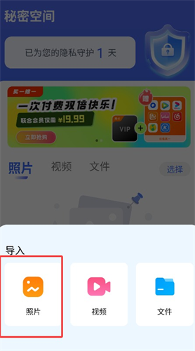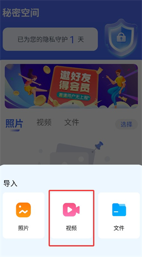 1、打开秘密空间点击导入视频选项,可快速将手机中的视频文件加密保存到隐私空间防止他人查看。