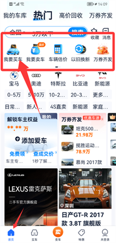 2、在首页提供买车、卖车及估价等核心功能入口。