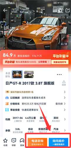 3、选定车辆后可电话咨询或查询底价,获取详细信息。