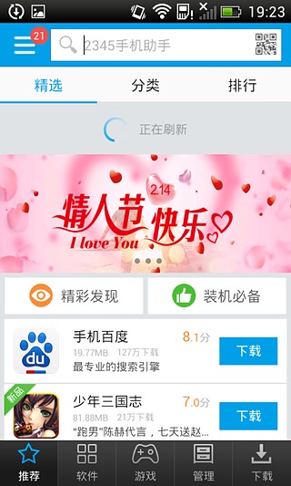 2345手机应用宝库(2345手机助手手机版)是一款安卓免费应用,它的功能类似于安卓市场,您可以将2345手机应用宝库安装到安卓手机上,2345手机应用宝库为您提供海量的免费安卓应用和游戏等资源,方便您一键安装下载和管理安卓应用