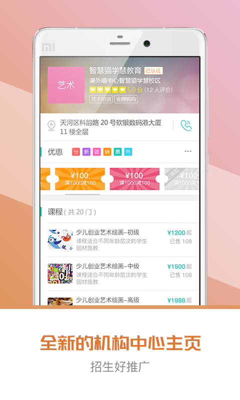 【课外喵的简单自我介绍】 商品重任:课外喵,着眼于让青少年的课外文化教育更简易,更丰富,更加有意义。 功能介绍: #精准投放,课外喵更懂你# 汇聚附近机构,检索“课程名”就可以显示信息配对的机构,暑假游学、暑期夏令营新项目让你不一样的意外惊喜。 #多方位一手信息内容,课外喵帮助你做决定# 课程內容、教师队伍、优秀学生、家长评价,多层次掌握机构状况。 #选修课方便快捷,随时一键提交订单# 支付方式更灵便,适用不一样机构多门冰箱课程另外提交订单,课程轻轻松松续费。 #课堂教学意见反馈,小孩子动态性轻轻松松掌握# 小孩的授课情况、成绩考试成绩同歩纪录,给你对小孩课外发展更为安心。