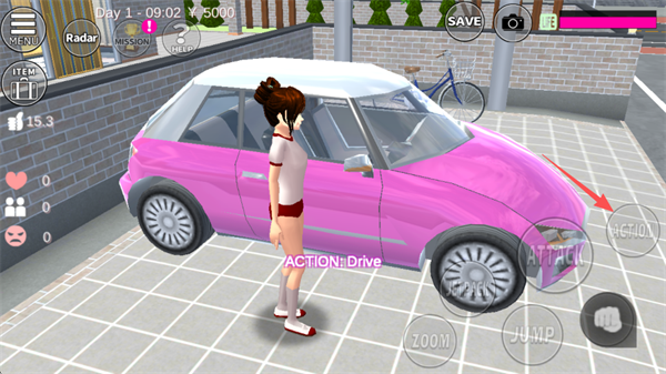 6、游戏玩法很自由,在游戏中你可以做任何事情,比如我们前往小汽车旁,点击ACTION;