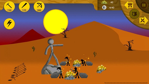 3、火柴人战争荣耀在战斗中每一个士兵都需要一定的矿石才能召唤,如果挖矿的工人速度太慢,可以点击【闪电】记号,使用钻石来增加挖矿速度。