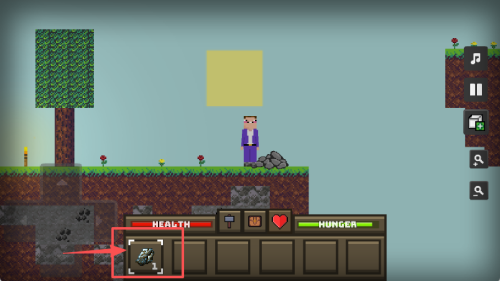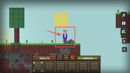 2、红框标出人物角色,下方状态栏显示生命值和饥饿值,右侧功能按钮可暂停或调节音乐。