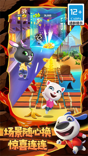你被打劫啦!探索无穷无尽的跑酷世界,让会说话的汤姆猫和安吉拉追强盗,夺回你的金子!不断发现新场景,体验不同跑酷风格,跑酷途中拾取加速器。酷跑有回报 - 你将能从零开始建造梦中的那个家……