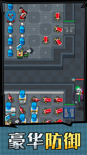 在游戏里面门升级也是有技巧的,因为老板在攻击时候会会降低门的血量,在血量快不足的时候升级门可以将血量瞬间拉满,这样就可以持续抵挡住老板的攻击了,然后继续发展自己的武器;游戏整体采用非常经典的Q版卡通画风呈现,丰富的放置塔防元素,搭配灵动悦耳的背景音效