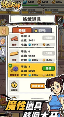 劈山大师免广告破解版是一款有趣的休闲益智类游戏,游戏采用卡通动漫式画风设计,在这里玩家将感受到非常魔性高效的游戏体验。玩家在游戏中扮演一位劈山大师,通过劈开山峰来寻找宝藏,玩家需要通过手指在屏幕上滑动控制大师劈山,劈出想要的形状以便寻找宝藏。游戏玩法也很简单,你只需要连续点击屏幕,蓄力就可以劈向目标,当你的耐力值耗尽时就会受伤,玩家需要多多注意。随着等级的提升,你可以开设自己的武馆,招募更多的学生,通过教授他们功夫来赚取金币,用金币来学习更强的武功秘籍。