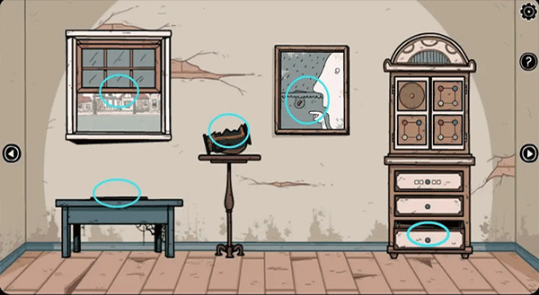 4、进入白门后面的房间,先拿走抽屉里的棋子,再观察墙上的画里种子生长的状态和手指的方向(会有所变化,根据实际情况来),接着打开窗户在左上角树冠上找到第一只猫头鹰。注:游戏中藏有九只猫头鹰,注意寻找哦。