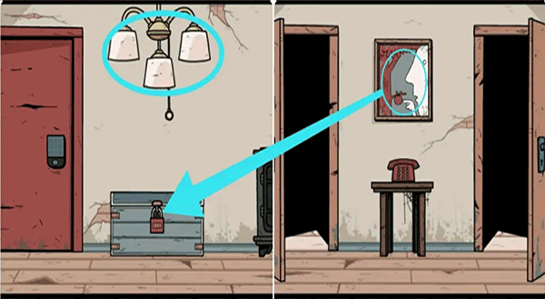 5、拿走灯罩里的两个灯泡,在其下面的箱子的密码锁上有四个箭头,而提示就是放在房子各处的四幅图画。