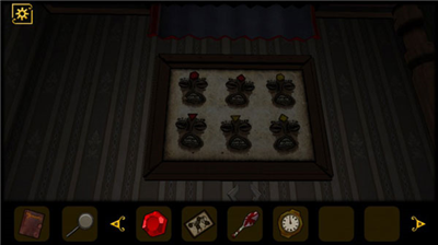 4、在留声机的背后获得房门钥匙,打开房门去往下一个房间,入眼即可看到一个钟表,绿色指针指向V